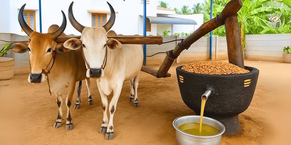 Oil is extracted by the traditional method using the wooden cylindrical device called chekku (also known as Marachekku in Tamil).